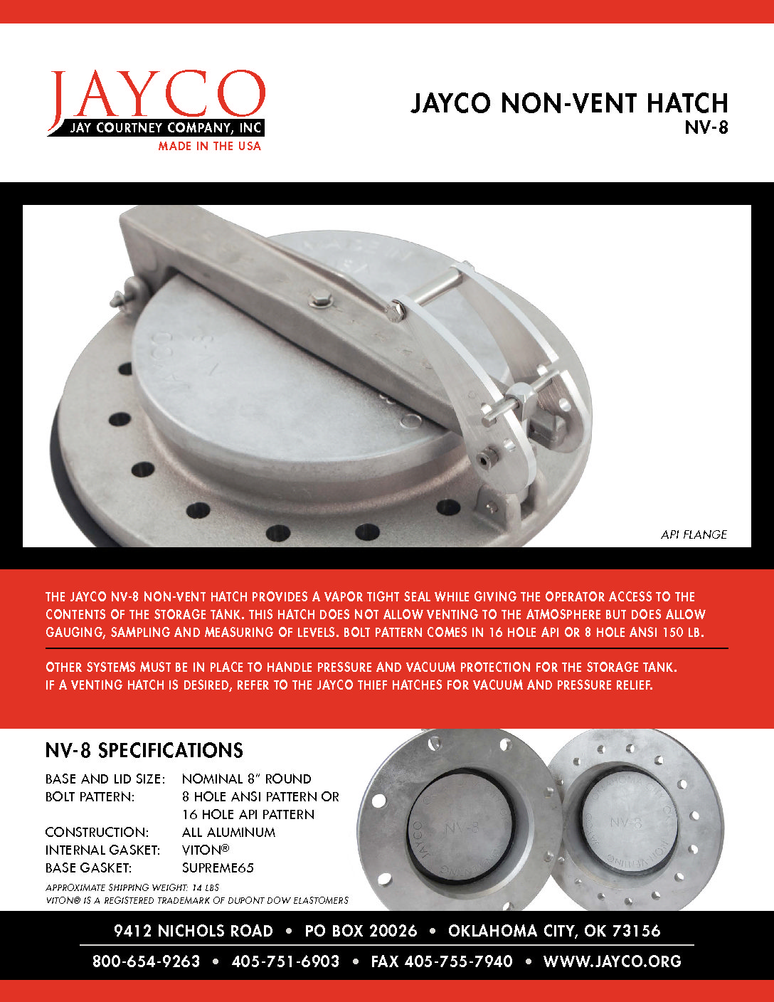 The Jayco NV-8 Non-Vent Hatch is specifically designed to provide a vapor-tight seal while allowing operator access to storage tank contents. As the official Jayco representative for Western Canada, ZIRCO provides this essential tank access solution that does NOT allow venting to atmosphere, requiring separate systems for pressure and vacuum protection.